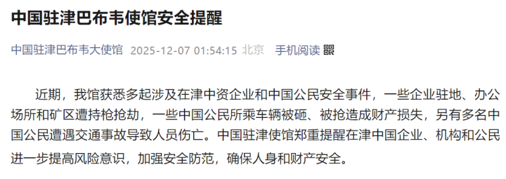近期普通人怎么加杠杆买股票,我馆获悉多起涉及在津中资企业和中国公民安全事件,一些企业驻地、办公场所和矿区遭持枪抢劫,一些中国公民所乘车辆被砸、被抢造成财产损失,另有多名中国公民遭遇交通事故导致人员伤亡。中国驻津使馆郑重提醒在津中国企业、机构和公民进一步提高风险意识,加强安全防范,确保人身和财产安全。