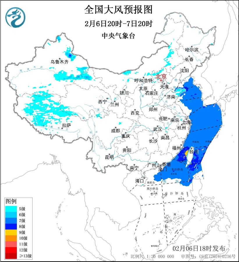 预计,2月6日20时至7日20时,新疆北部和东部、内蒙古中东部、山东半岛、西藏中西部等地部分地区有5~6级风,阵风7~8级;黄海大部海域、东海海域、台湾海峡、台湾以东洋面、巴士海峡、南海北部海域将有7~8级、阵风9级的大风,其中台湾海峡部分海域风力可达9级、阵风10级。