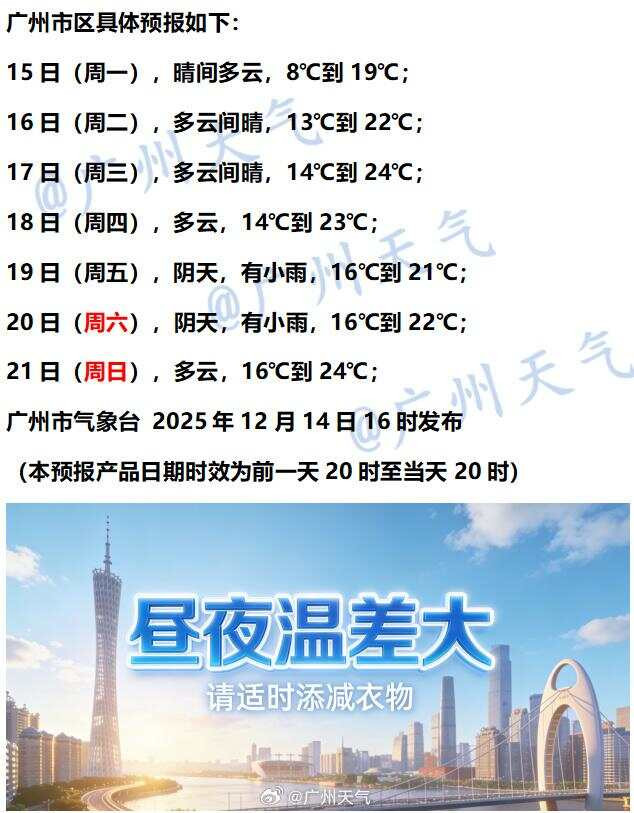 别急,16日起天气就会好转,以多云间晴为主,气温也将稳步回升,白天最高温可达24℃。“早晚裹棉袄,午间穿单衣”的经典操作,广州人又要熟练拿捏了。