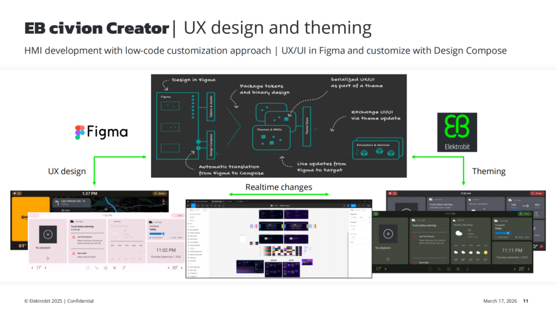 高阶 SDV 的核心体验载体是智能座舱,Elektrobit 在 2026 年 CES 展推出全新EB civion Creator云原生虚拟开发平台,基于 Linux 与 Android 打造,实现座舱应用的云端开发、验证与部署。该平台覆盖 UI/UX 设计、交互逻辑开发、信号模拟全流程,支持 Figma 设计与 Design Compose 低代码定制,实现设计元素与交互逻辑的解耦,提升开发生产力。设计成果可实时同步至云原生平台与现有测试台架,无缝衔接实车 ECU 屏幕,还能通过主题库与 AI 大模型解析,快速实现座舱主题定制。针对座舱 ECU 与外部信号的交互痛点,平台配套配置工具可虚拟化外部 ECU 信号,将数据集成至虚拟系统,基于应用逻辑与通讯信号完成测试,实时检测信号通讯、丢帧、卡顿等问题,提前验证座舱功能稳定性。Elektrobit 在论坛现场设置该平台的实时演示,直观展示云原生座舱开发的全流程能力,为车企打造个性化、智能化座舱提供便捷工具。